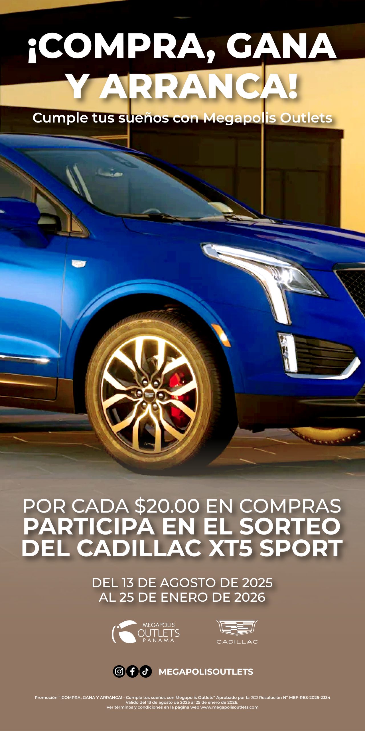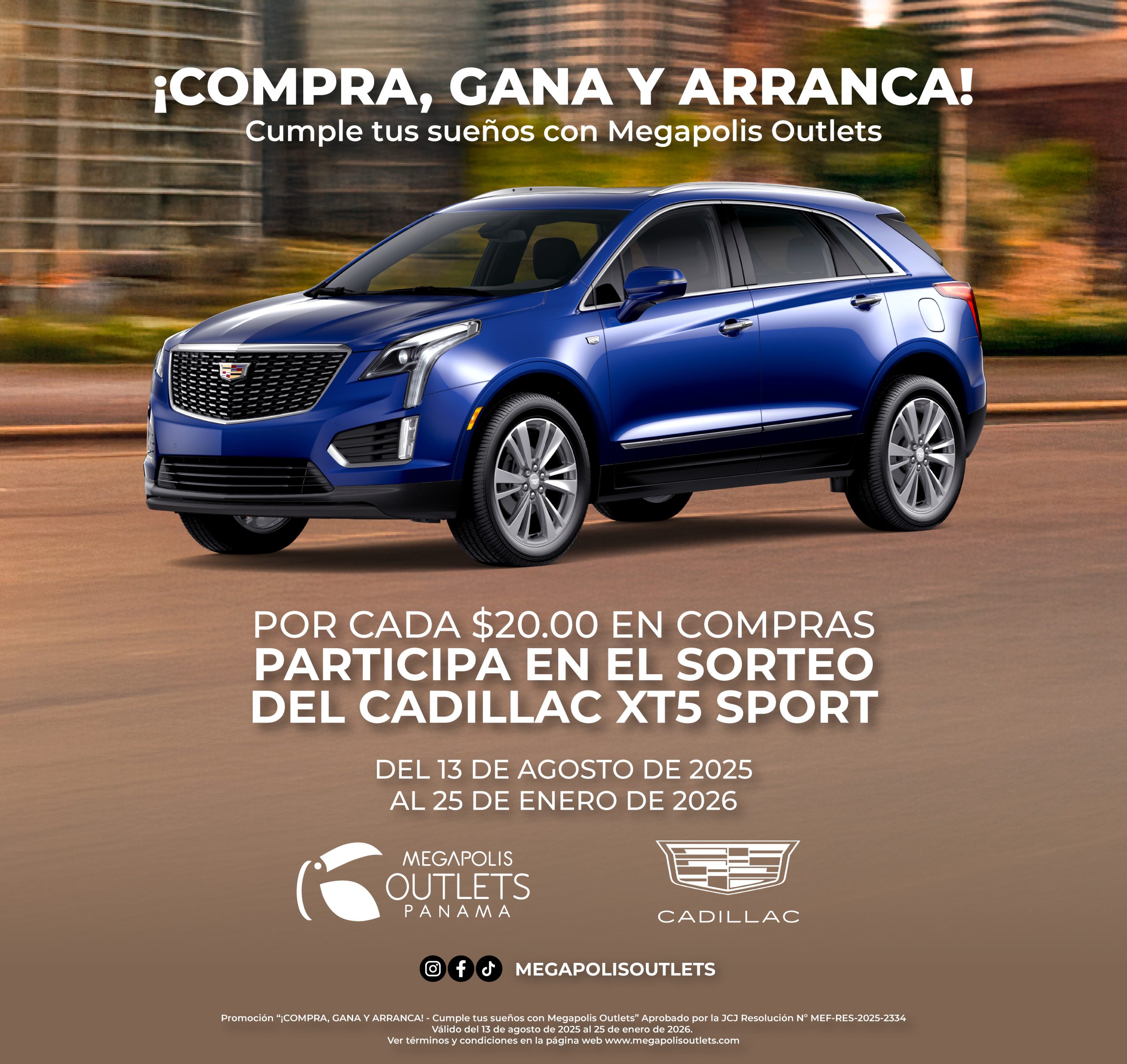 Por un mínimo de veinte dólares (US$ 20.00) de compra en cualquiera de los establecimientos comerciales y de entretenimiento ubicados en el P.H. MEGAPOLIS OUTLETS PANAMA, incluyendo los establecimientos de expendio de comida y bebidas del PH. Megapolis Outlets Panamá, Decapolis Hotel y Megapolis Hotel y siempre que el mínimo de la compra sea registrada en una misma factura fiscal correspondiente al local comercial en el que se realizó; el cliente recibirá un cupón con la indicación de los datos que debe llenar y con el cual podrá participar en una tómbola presencial en la cual podrá hacerse acreedor a: Primer y único Premio: Auto CADILLAC XT5 SPORT AÑO 2024.